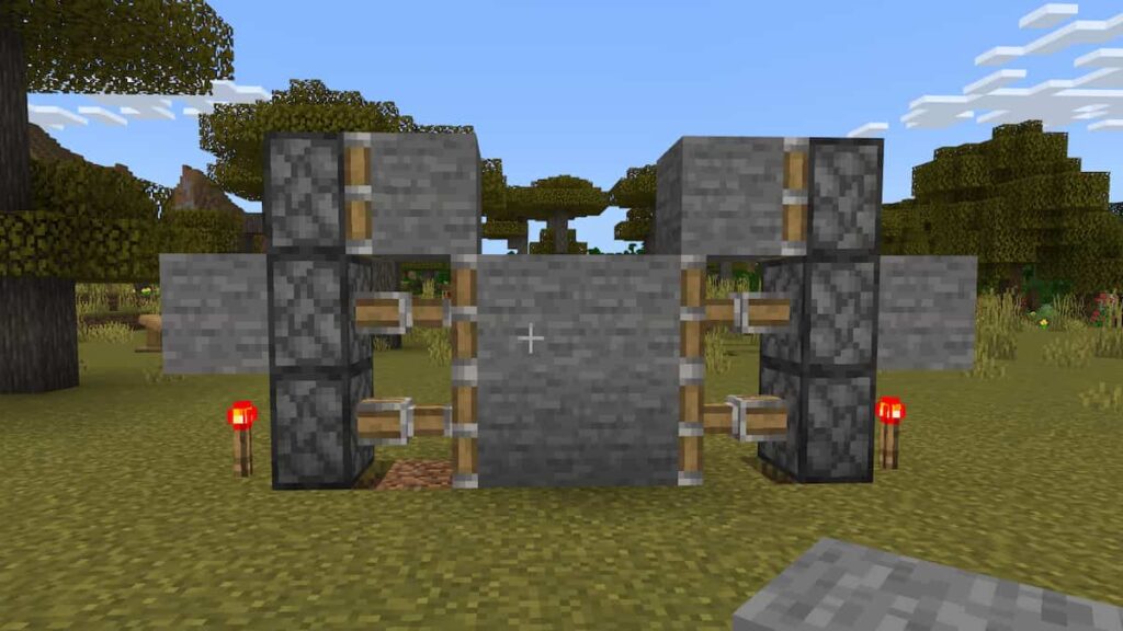 Take some Stone Blocks and place them in front of the Sticky Pistons. The blocks will act us as our secret door.