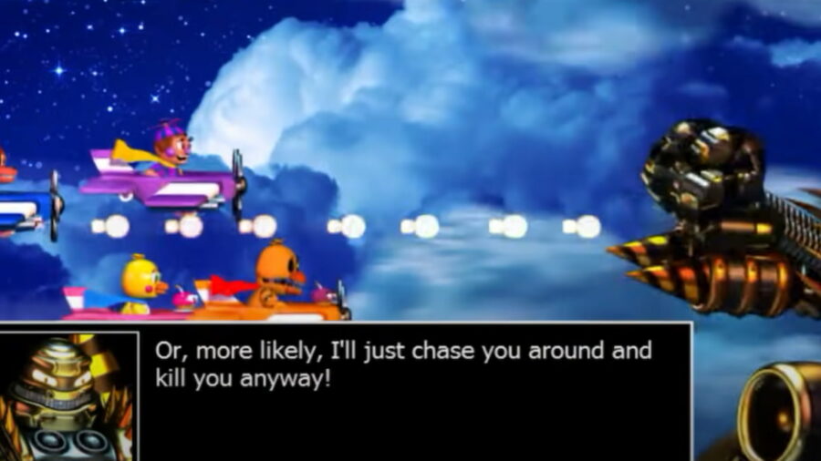 As Foxy, players will fight in a plane alongside several other animatronics. Defeat the cupcakes and anything else that drops into view while dodging their attacks. Be extra careful when Chica asks the player whether they'll get tired of her voice, as the screen will fill with her icon. Then battle Souldozer to complete the minigame.