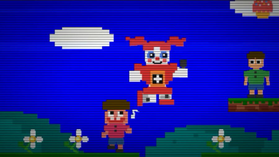 As Chica, players will have to make it through the Mario-like level. The first is just dodging flower petals, but a new challenge will be added after each checkpoint. Essentially, each level will become harder and harder as the voice becomes more and more patronizing in the background after each death. The rainbow's eyeball section is the last.