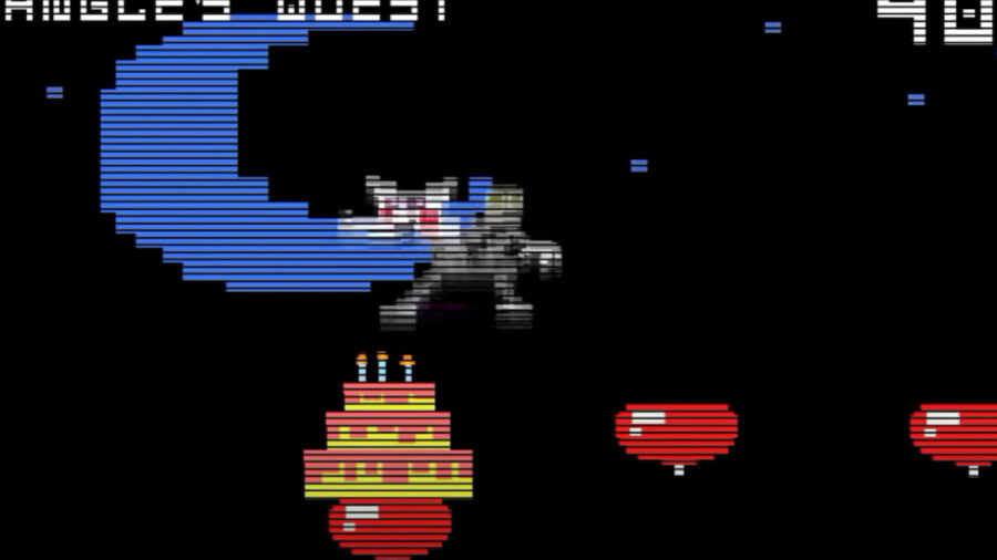 Survive as Freddy is another platformer, this time with lasers! Freddy has a gun so he can shoot down the adjustable lasers in his path to drop hearts. When the path opens up to go nearly straight down to the right, use the platform to head up instead. At the top of the next area, head into the secret area in the top left, through the fake wall to grab a cupcake.